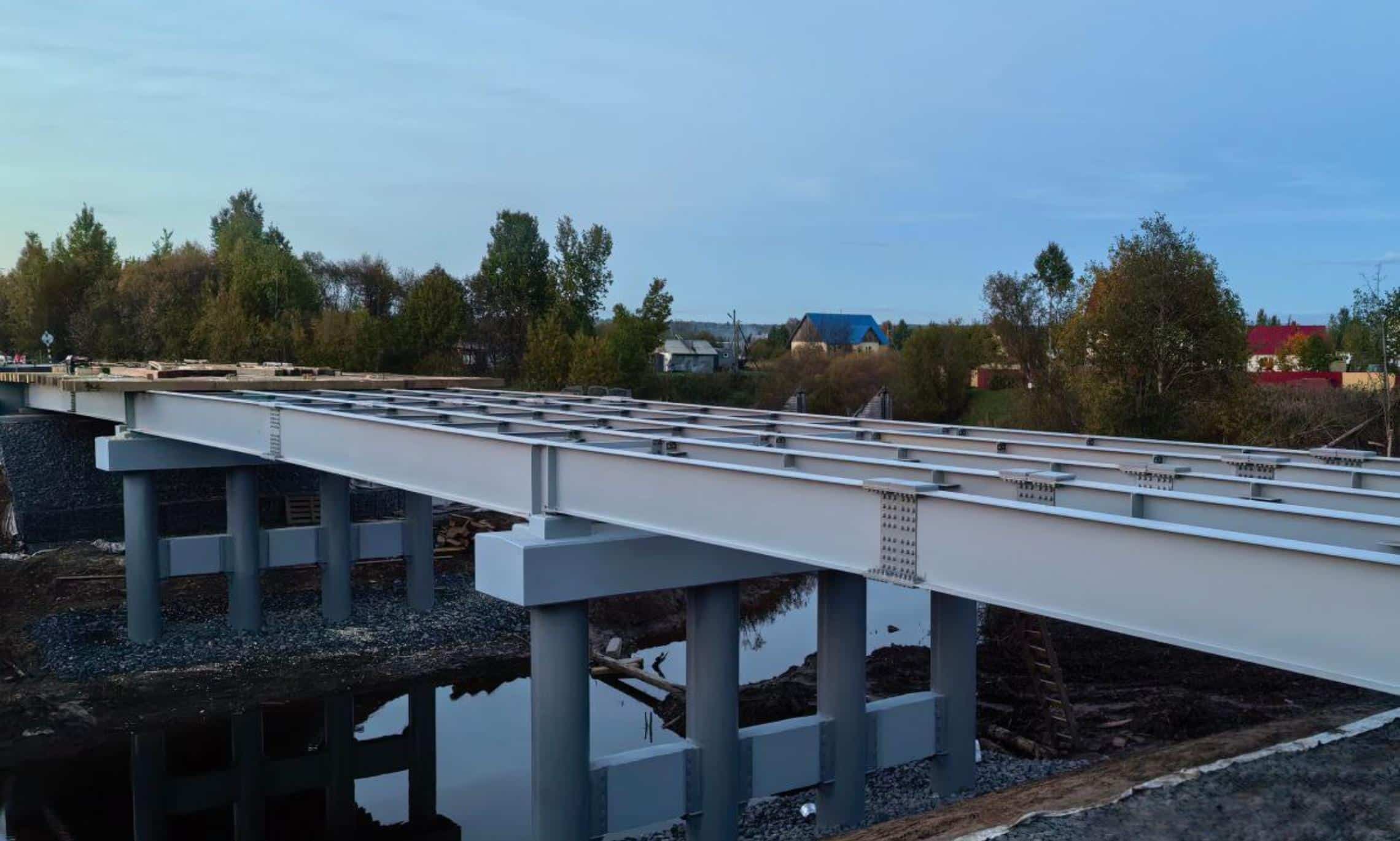 В Приморском округе дорожники завершили монтаж балок пролетного строения моста через реку Ижма и приступили к устройству мостового полотна. Как сообщает информационное агентство «Регион 29», основные работы планируется завершить к концу октября. После этого начнется демонтаж временного